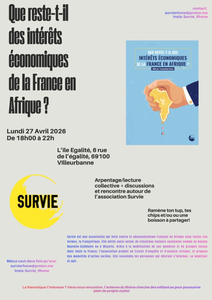 L’association Survie (antenne Rhône) propose de se retrouver pour un arpentage (technique de lecture collective) autour de l’ouvrage « Que reste-t-il des intérêts économiques de la France en Afrique ». S’appuyant sur des données statistiques inédites et une analyse de long terme, ce rapport montre que si les intérêts économiques français ont fortement reculé à l’échelle macroéconomique, les entreprises françaises continuent de peser très lourd dans plusieurs pays d’Afrique subsaharienne, en particulier dans l’ancien pré-carré colonial. Une asymétrie profonde, largement invisible depuis la France, mais aux effets politiques, sociaux et démocratiques majeurs.